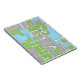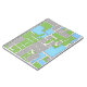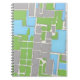Uma visão de pássaro de uma cidade com várias formas e um esquema de cores de cinzas, verde e azul.