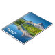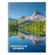 Notebook espiral com imagem de montanha e lago com texto branco "Montanha Lake Notebook". Perfeito para uso escolar, de escritório ou doméstico.