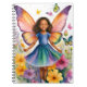 Notebook de 6,5 x 8,75 polegadas com uma jovem fada de menina com asas vibrantes de borboleta cercada por flores coloridas, expondo um senso de magia e capricho. Seu vestido espelha as matizes das asas, combinando as borboletas brilhantes fluindo ao seu redor.