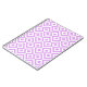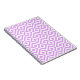 O notebook espiral apresenta uma lavanda decorativa e um padrão geométrico branco. Diamantes de Lavanda com bordas brancas são cercados por meandros roxos leves que os rodeiam. Os ziguezags brancos separam os caminhos púrpuros bobos e os diamantes em offset.