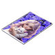 Uma menina loira cabeleira está segurando um gatinho branco. Ambos têm olhos violentos. Há um fundo floral roxo. Eu acho que é bonito para meninas, ou mulheres que usam um caderno como um diário.
