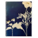 Impressão de cianótipo de marigóides dourados feitos por artistas em um caderno espiral de vazios.