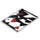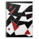 Várias formas geométricas brancas e vermelhas estão espalhadas sobre um fundo preto, criando um forte contraste. Algumas formas são interconectadas com linhas brancas finas, e pontos vermelhos adicionam um pop de cor à composição.