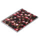 Fotografia das cerejas vermelhas que se estendem aos bordos do bloco de notas.
