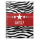 Notebook Tendy e moderno Sassy Star Zebra, com um fundo de impressão em branco e preto chico e uma borda vermelha ousada, enfeitiçada com um divertido motivo de estrela. Este design feminino pode ser personalizado com o texto personalizado de sua escolha. Clique em "Personalizar" para encontrar mais opções de personalização.