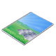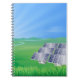 Energia renovável através de pilares solares num campo verde. Este design parece realmente eficaz neste notebook espiral