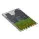 Uma cena 3D criou em Vue, mostrando o local de uma batalha antiga, com apenas as ruínas desmoronantes de uma torre de pedra medieval e flores vermelhas na grama para comemorar. A chuva em queda e o efeito de aquarela macia aumentam a tristeza da cena do topo da colina.