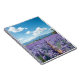 This notebook has an outdoor scene with a field filled with purple flowers and distant mountains.