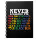 Este notebook espiral apresenta o texto "Nunca se Desculpe pelos Seus Pensamentos Pretos, Sua Lealdade Preta, Seus Motivos Pretos, Sua História Preta, Seu Orgulho Preto ou Nossa Pele Preta". É perfeito para afro-americanos para celebrações da liberdade, celebrações da emancipação, 19 de junho ou qualquer outra ocasião.