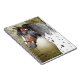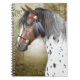 Este notebook apresenta um trabalho de arte digital original de um Pôneo Índio Appaloosa em uma ponte vermelha, com sotaques e penas ouros, da artista Jayne Wilson.