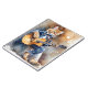 Arte de salpicos de aquarela de um gato de mesa laranja tocando violão.