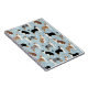 Pastores australianos lindos / Cães australianos em casacos pretos, marrons e de funil sentam-se e mantêm ossos de cães espalhados e estampas de pata em um fundo azul claro.