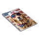 Um recuperador de ouros, munido de óculos de sol de aviador, uma bandeira americana em um boné, e uma bandana correspondente se coloca em frente a uma bandeira americana.