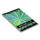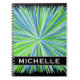 Este design de notebook vibrante apresenta um padrão de linhas coloridas de tons diferentes de verde e azul explodindo para fora de um ponto central, em um fundo preto. Ele também apresenta um nome personalizado.