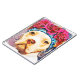 O retrato branco de um lindo cão pitbull de cor creme com olhos macios, vestido com ornamentado, faixa azul, flores rosa e brincos capturará seu coração com sua doce expressão. Esta bonito gravata é certamente uma favorita com seus amantes de cachorro favoritos.