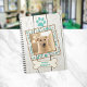 Mantenha suas notas e registros em um único notebook com esta foto personalizada de animais de estimação e modelo de título na frente. Ele tem um fundo branco de madeira curada, impressão verde oceânica e estrutura de bolinhas com borda marrom. Osso branco com o seu próprio título sob a fotografia.
