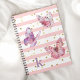 Um design bonitinho especialmente para meninas, este notebook tem um padrão de listras horizontais rosa e branca com bolinhas de ouro espalhadas. Três belas borboletas em tons rosas, roxas, lavandas e brancas, acima do seu monograma inicial. Personalize o modelo de texto com seu monograma ou outro texto desejado.