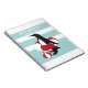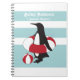 Um pinguim está de pé com um tubo interno vermelho e branco e bola de praia com um fundo azul claro e branco. Este lindo animal de desenho animado com texto personalizado faz um caderno único e fofo para crianças.