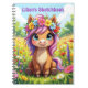Um notebook personalizado bonito ao qual você pode adicionar o nome do seu filho. Um pônei adorável com um anel de flores roxas e cor-de-rosa na cabeça. Uma doce ilustração de ai branca que é brilhante e colorida em rosa, azul, amarelo e roxo.