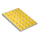 Esta design apresenta kernels de pipoca saltados dispostos em uma grade nítida em um fundo amarelo. Um kernel só está meio aberto.