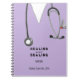 Um único notebook de enfermeira com escovas hospitalares, estetoscópio e um canivete suíço. Para personalizar editar texto para adicionar nome e ano.