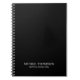 O notebook profissional apresenta o nome personalizado e o texto no estilo de fonte de serif clássico branco em fundo preto.