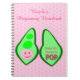 Este incrível notebook apresenta uma imagem gráfica de uma vagem verde de ervilha contendo 2 ervilhas verdes e uma grande ervilha rosa. A ervilha rosa grande tem um rosto bonito com olhos e boca. Do outro lado da ervilha, em texto cor-de-rosa mais escuro, está escrito "Baby Girl Ready to Pop". Há um grupo de pequenas ervilhas rosa no fundo. Há texto personalizado para que você possa incluir o nome da futura mãe e uma mensagem.