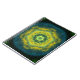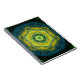 O cobrir deste notebook psicodélico apresenta amarelo, verde e azul vibrantes em um padrão caleidoscópio.