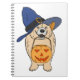 Whimsical cartoon dog in a wide wizard hat carries a glowing jack-o'-lantern. Bold lines, warm autumn colours, Halloween vibe, ideal for playful apparel and festive gifts.