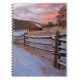 Esta foto caracteriza um celeiro rústico coberto de neve na frente de um por do sol bonito em um rancho de Colorado.
