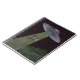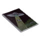 Um lápis a cores de uma vaca infeliz sendo raptada por aliens em um disco voador em uma noite escura e estrelada. A manada assustada se abraça ao fundo.