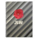 Um notebook elegante com flor de Hibiscus vermelha e listras monocromáticas modernas em tons suaves de cinza personalizados com Iniciais ousadas é um estilo único e sofisticado para seu Journaling e manutenção de notas. Esta é a fotografia botânica original de JLW_Photografia.