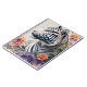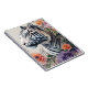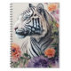 Trabalho de arte de Watercolor apresenta um tigre branco impressionante com olhos azuis rodeados de pêssego e flores roxas, uma justaposição de perigo animal selvagem e de beleza frágil da flora. Uma imagem de perfil felino feroz com uma estética floral feminina.
