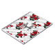 Rosas vermelhas em fundo branco com bolinhas pretas.