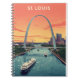 Esta Rua. O notebook Louis apresenta uma ilustração do estilo vintage da "Gateway Arch", com vista para o rio Mississippi no pôr do sol. A arte cobrir captura o marco icônico e um ribeiro clássico, celebrando o encanto histórico e arquitetônico da cidade. Este caderno espiral é perfeito para fazer jornalismo, anotações ou como um presente único para qualquer um que ama o retroapelo do "Gateway to the West".