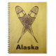 Um par cruzado de sapatos de neve num fundo de couro braintan. O texto personalizável lendo "Alaska" também é exibido. Há vários estilos diferentes de sapatos tradicionais de neve. As imagens aqui são feitas de Ash e moosehide babiche (webbing) no padrão do Alasca. Maior e mais fino que alguns outros estilos, como a pata de surra, os sapatos de neve do Alasca permitem uma porta mais natural e são adequados para o viagem entre países. As dicas levemente viradas para cima permitem que você arraste os pés um pouco. Aconselhem-se os calçados de neve a fazer um céu excelente; geralmente no pior momento possível.
