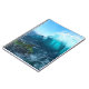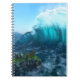 Uma onda massiva salta de mares ásperos, cintilantes brancos e azuis e turquesa na luz solar brilhante. Sob a onda, prestes a ser submersa, está uma pequena cidade com um castelo e cabanas medievais construídas sobre uma terra firme.