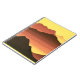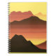 Notebook em montanhas retroradas e minimalistas do deserto ao pôr do sol, em tons de laranja ferrugem profunda, ouro amarelo e marrom