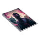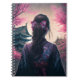 Computer generiertes Design einer Geisha in einem Kirschblüten Wald. Abbildung einer Frau mit einer hübschen Zopffrisur und Blüten im Haar welche einen Kimono trägt. Japanisches Design im AI Stile. Im Hintergrund zwei Japanische Gebäude.