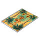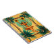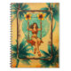 Das Bild zeigt eine lebendige Illustration einer Frau, die auf einer Schaukel zwischen üppigen Palmen schwebt, umrahmt von großen, leuchtend gelben Blüten. Ihr buntes Outfit und das warme, verblichene Hintergrundmuster strahlen eine nostalgische, tropische Stimmung aus, während die türkisfarbene Sonne im Hintergrund Hoffnung und Leichtigkeit verleiht. Die Szene vermittelt ein Gefühl von Freiheit, Abenteuer und unbeschwertem Genuss inmitten einer exotischen Natur.