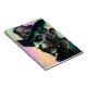 Esta trabalho de arte impressionante apresenta uma figura grotesca, tipo zombie, vestindo um chapéu esfarrapado adornado com engrenagens. O personagem tem olhos laranja vívidos e uma expressão sombria, cercada por um fundo abstrato colorido.