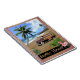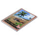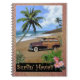 Belo retrô, mostrando um carro antigo com pranchas no topo da praia, cercado por vegetação tropical. Texto "Surfin' Hawaii".