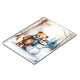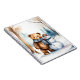 Urso de pelúcia castanho, de cor aquática, na floresta de inverno, com boneco de neve.