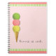 Notebook criativo tênis, com bolas coloridas de tênis empilhadas, colheres de cone de sorvete empilhadas em fundo rosa.