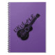 Desenho preto com texto personalizado. Notebook ukulele personalizado com fundo roxo. Design original. Ideia de presente para amantes de ukulele.
