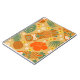 Impressão tropical havaiano com sombras ou laranjas, dourados, verdes e amarelos. Impressão divertida que incorpora cabeças de totem tiki, flores de hibisco e folhas de palma.