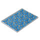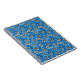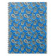 Vibrant paisley patterns in shades of blue, teal, black, and white are arranged on a bold blue background. The design features intricate swirls and dots, creating a dynamic and stylish visual effect.