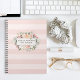 Acompanhe seus compromissos, dados do cliente e muito mais com nosso notebook floral chic. Design apresenta um tom sobre fundo listrado cor-de-rosa pincelado e pincelado com seu nome e/ou nome comercial em um crachá floral de cor d'água com grupos de flores cor-de-rosa pincel, pêssego, rosa de creme e pérola e pénicas. Perfeito para salões, estilistas, maquiadores ou qualquer negócio.