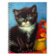 Notebook com um lindo gato de smoking Van Gogh! Esta pequena gatinho se posiciona ao lado de uma cesta de flores laranja sobre uma mesa vermelha. Um presente de excelente para amantes de gatos e colecionadores de arte holandeses!