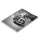 Um caderno espiral fotográfico com um velho e antigo carro FIAT 500 numa rua de uma cidade na Itália, a preto e branco na moda.